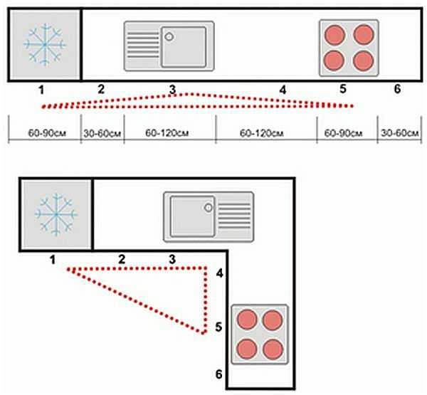 Пример расположения основных устройств на кухне: плиты, мойки и холодильника