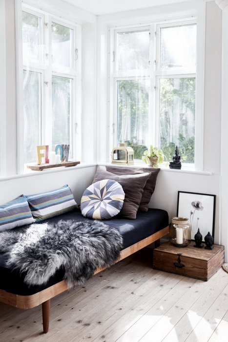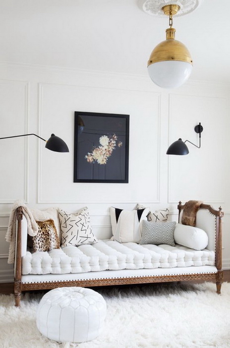 Фермерский стиль для кушеток тоже весьма уместен и интересен. Его отлично дополняют геометрические подушки, богатые цвета, меха и обилие солнечного света. А если еще рядом с такой кушеткой еще и поместить какой-нибудь деревенский антиквариат, то она наверняка станет самым милым уголком для отдыха.