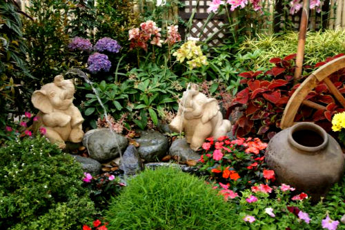 Природный ландшафт сможет подчеркнуть небольшой пруд, который можно изготовить из старой ванны, крупной обрезанной бочки или корыта. Вокруг импровизированного пруда, можно высадить камыш, вербейник и влаголюбивую рогозу.