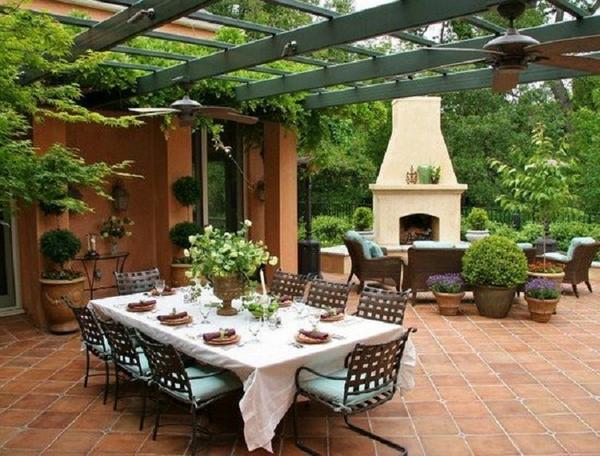 Определенные преимущества имеет летняя кухня открытого типа с террасой, где можно насладиться трапезой на свежем воздухе. В жаркое время года она станет незаменимым помощником. Здесь можно также проводить различные семейные торжества, встречать гостей, либо использовать это пространство для проведения подготовительных работ к консервации и другим процессам по приготовлению пищи. Дизайн-интерьер таких кухонь может быть совершенно разнообразен. Как правило, территория разделена на функциональные зоны, одна из которых служит, непосредственно для приготовления пищи, а другая — для отдыха. Возможны также разделения территории на маленькие функциональные «островки» (отдельно расположенная плита, зона для глажки, стирки и т. д.), с размещением обеденного стола, кресел, камина, барбекю, плиты и прочего оборудования на усмотрение хозяев. Летняя кухня с верандой размещается на расстоянии 10 — 12 метров от дома для удобства проведения коммуникаций. Безусловным плюсом такого строения является хорошая проветриваемость, а также ощущение пребывания на природе. Есть у нее и некоторые недостатки, к примеру, присутствие назойливых насекомых.