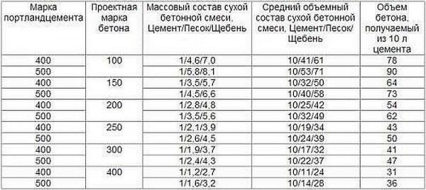 В рецептурах составления бетона даны по весу или объему. Причем цемент всегда приниматься за 1, а все остальные компоненты берутся по отношению к нему. Пропорции для часто используемых марок приведены в таблице.