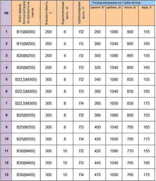 Пропорции бетона на один куб. Масса компонентов указана в килограммах, в скобках даны части.