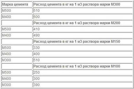 В другую таблицу сведены данные по расходу цемента М400 и М500 на кубометр самых популярных марок бетона при строительстве фундамента.