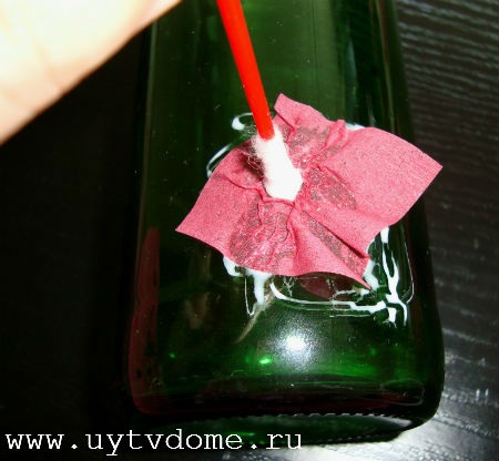 Прикладываем к проклеенной поверхности салфетку, в центре которой, устанавливаем ватную палочку, и аккуратно вокруг нее создаем складки (в созданные «кратеры» будут наклеиваться стразы).