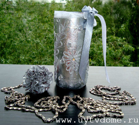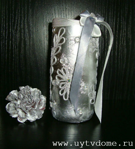 Будущая ваза из стеклянной бутылки, будет оклеена салфетками (со складками-морщинками), покрашена в хромированный цвет, а также дополнена нитяными узорами, стразами и ленточками. Приступим…