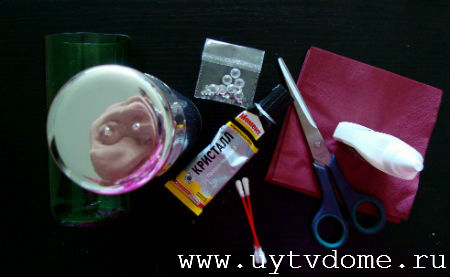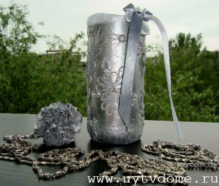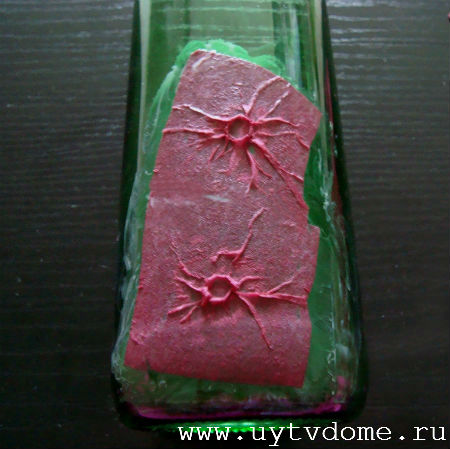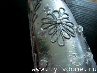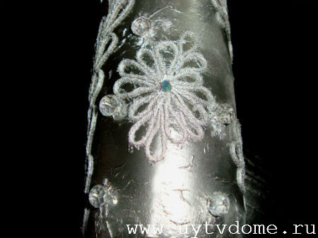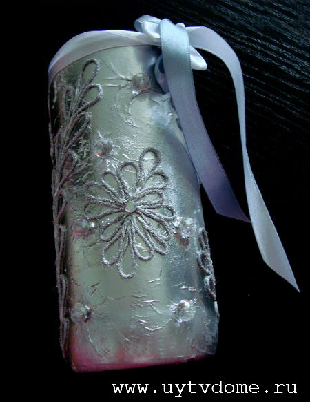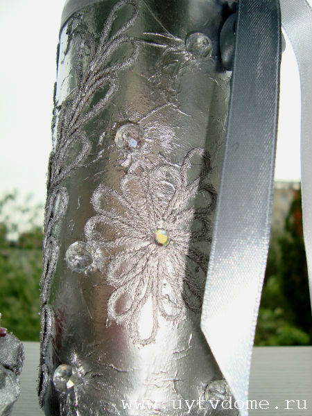 Оставляем изделие сушиться, примерно на 30-40 минут. После чего наклеиваем стразы, в предварительно созданные «кратеры». А на завершающей стадии, по желанию, повязываем на горлышко вазы — подходящие по цвету ленточки.