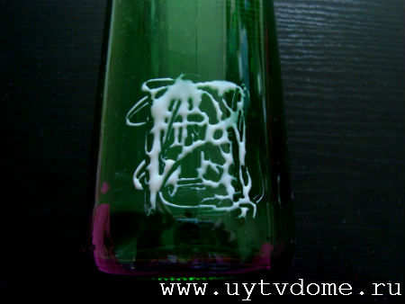 Наносим клей ПВА на поверхность стеклянной бутылки.