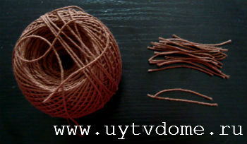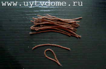 Во время сушки салфеточного слоя, приступаем к созданию узоров. Нарезаем шерстяную нить отрезками 3-3,5 см. После чего приступаем к созданию «узоров-лепестков», для этого соединяем две части нитяного отрезка вместе, проклеивая прозрачным клеем (см. фото).