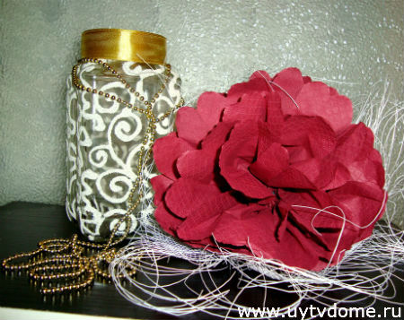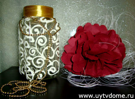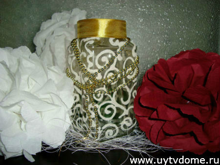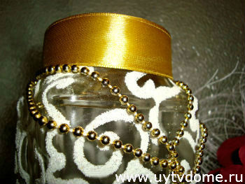 Когда лак полностью просохнет, можно приступить к дополнительному декорированию. Необходимо повязать на горлышко банки ленточку с бантиком или без, свободно струящуюся или плотно обмотанную вокруг горлышка. А узоры вазы из манки, дополнить стразами (по желанию, на данном изделии стразы не использовались).
