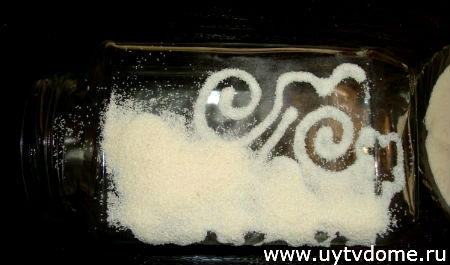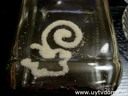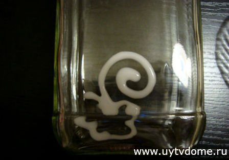 Ну что ж, приступим к декору манкой, берем стеклянную банку, наносим клеевый узор (можно сразу нанести узоры на всю лицевую часть банки).