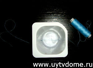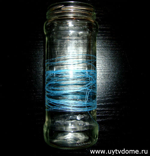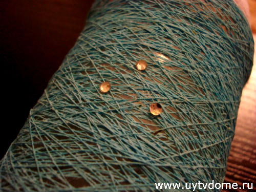В образовавшиеся отверстия продеваем нить, которой и будем в дальнейшем, декорировать вазу. Затем сюда, в стаканчик с нитью, вливаем клей ПВА.