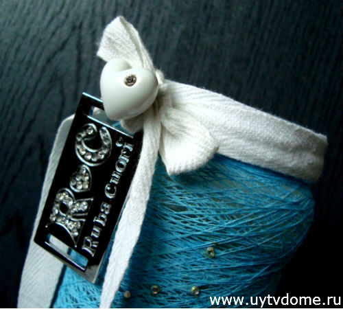 Теперь вновь вернемся к ленте, ее можно завязать одинарным или двойным бантиком, а можно оставить простой узелок. На нашей вазочке повязан бантик, в который вдета металлическая бирка со стразами (продаются в швейных ателье). А на сам бантик наклеено белое сердечко, тоже со стразиком.