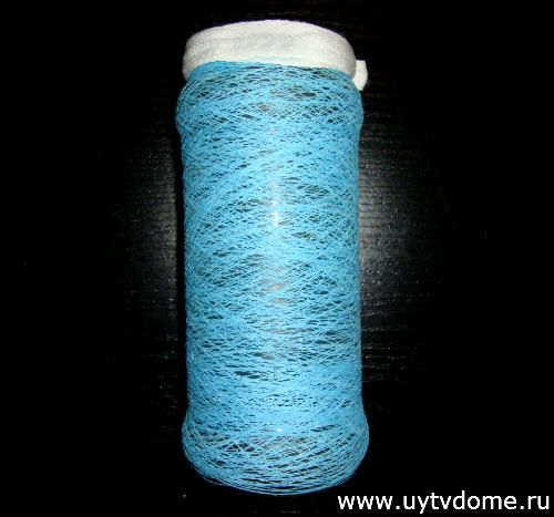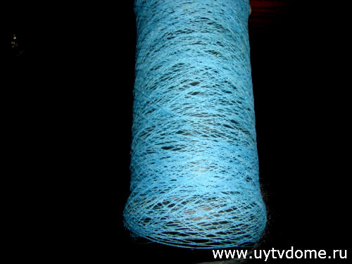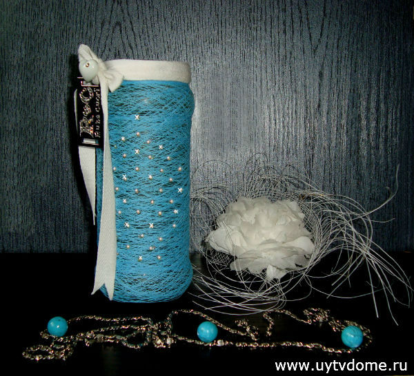 В результате у нас получилась небольшая, эксклюзивная, голубая вазочка (20 см в высоту), декорированная нитками и дополненная стразами, которая чудесно дополняет интерьер, даря тепло и положительные эмоции!