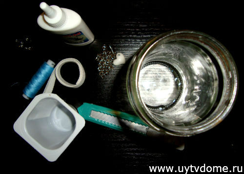 Для работы, необходимо подготовить следующие предметы: прозрачную стеклянную вазу (высокий стакан или баночку из под солений), одноразовый стаканчик, катушку ниток, канцелярский нож (или ножницы), клей ПВА, стразы, ленту, металлическую бирку (необязательно, по желанию).