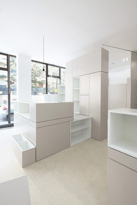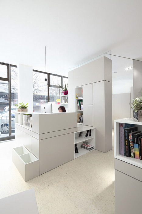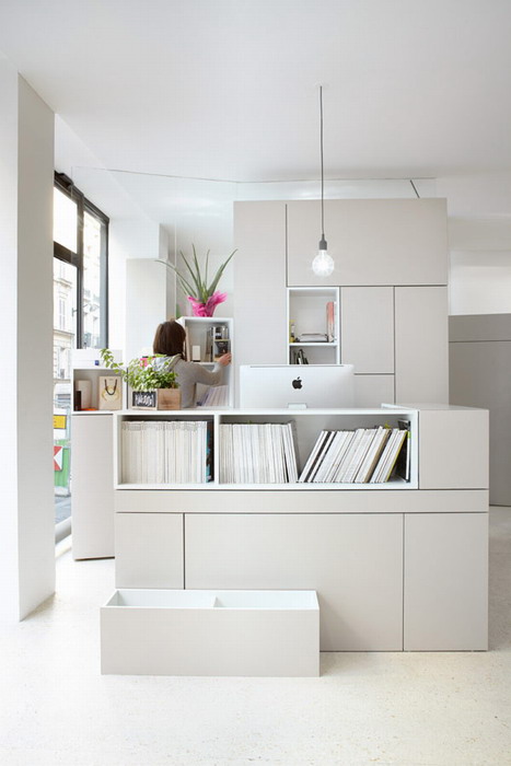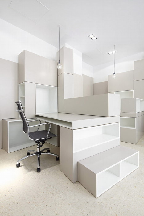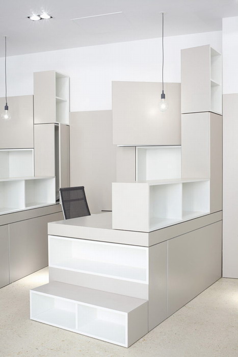 Рабочие столы, компьютеры, полки, шкафы — всё светло пепельного оттенка правильных прямоугольных форм.