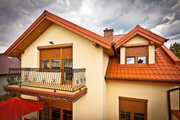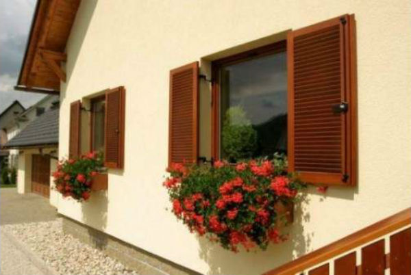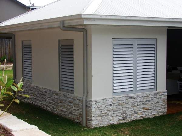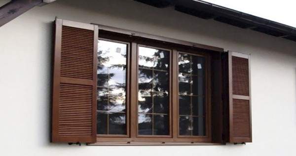 А вот для дома, облицованного камнем или кирпичом, можно подобрать металлические наружные жалюзи в одном тоне с цветом крыши. Так ваше здание будет выглядеть гармонично и аккуратно. Вот как на этих фото.