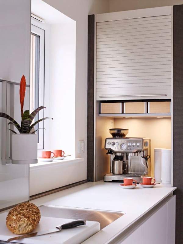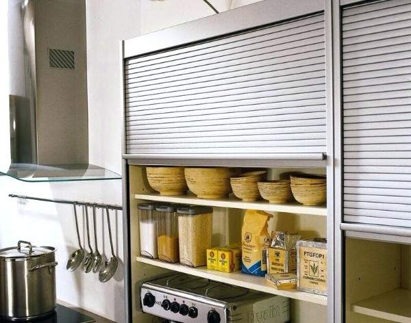 А вот как оригинально можно применить металлические горизонтальные жалюзи в дизайне кухни. Как вам такое решение?