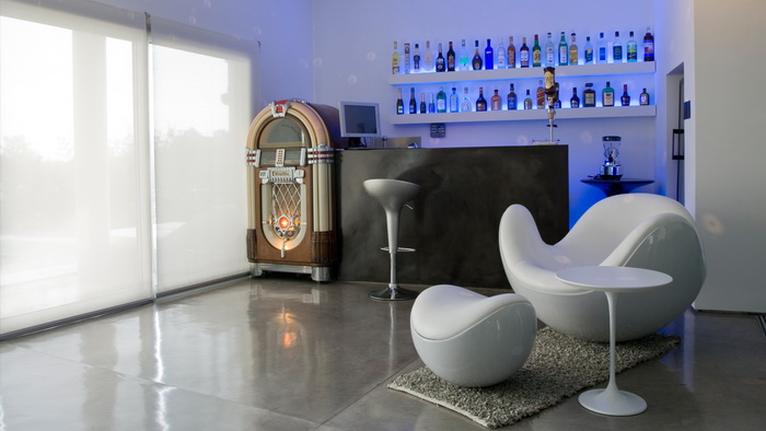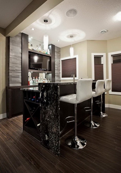 При желании и возможности, можно организовать полноценный бар дома. Для этого вам понадобится барная стойка, основание которой будет оборудовано специальными полочками для хранения напитков и бокалов, а также сет из подходящих по дизайну барных стульев.