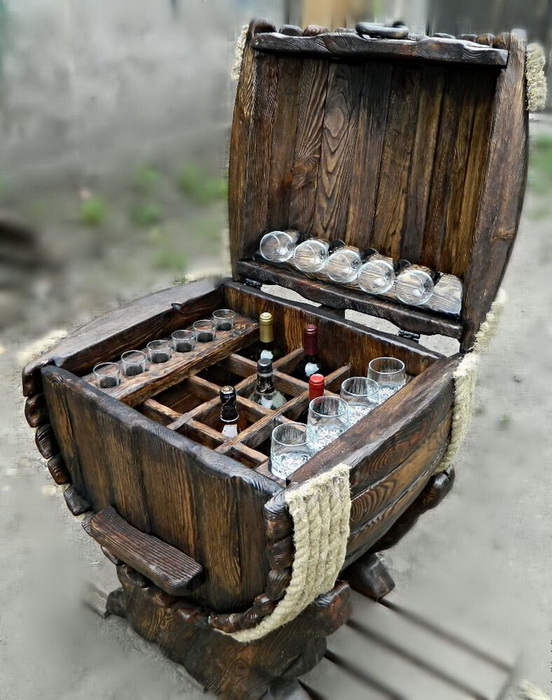 Если фантазия работает, как нужно, то мини-бар дома можно сделать из самых неожиданных материалов и предметов. Как Вы видите, мини-бар в чемодане смотрится очень оригинально и достойно.