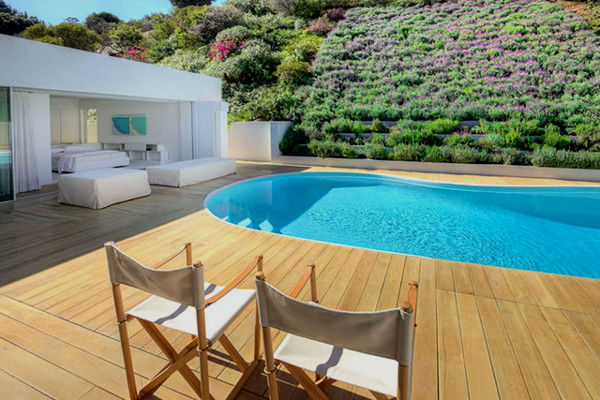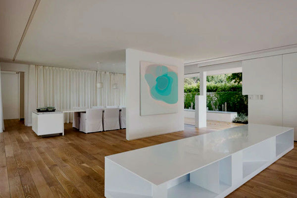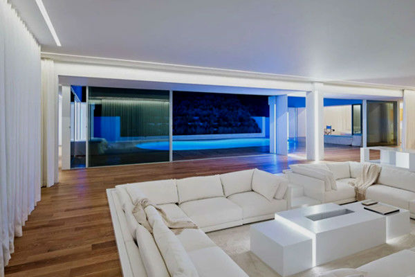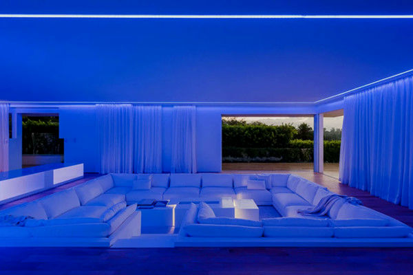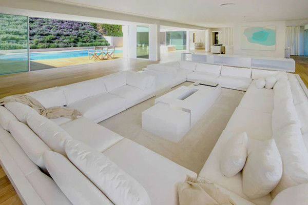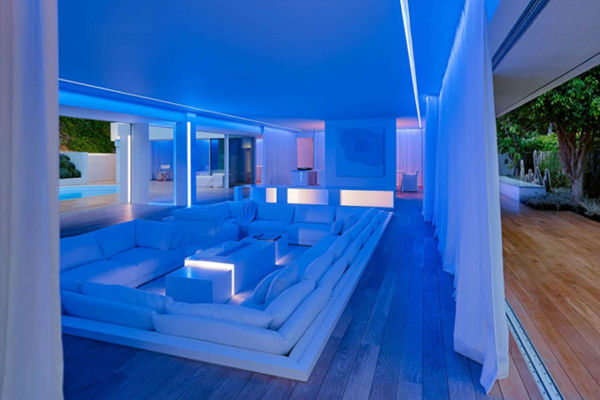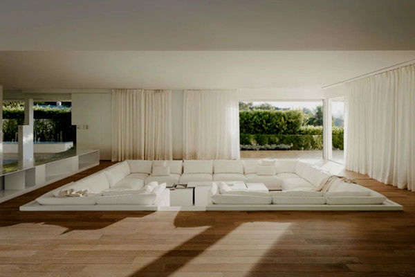 Из интересных фишек хотелось бы отметить гостиную комнату с утопленным под пол диваном или правильнее будет сказать диванами. Дело в том, что в полу находится довольно крупная по площади ниша, в которой отлично устроились несколько диванов. Смотрится такой ход очень интересно! Из этой комнаты можно быстро и легко попасть на террасу, где есть бассейн. В целом, здесь все продумано для комфортного времяпрепровождения.