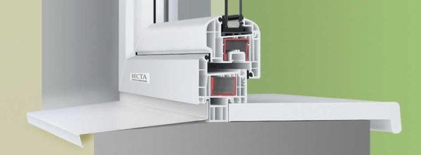 Под установку отлива, в профиле рамы есть специальный выступ. Под него заводится верхняя кромка отлива. Но этот выступ доступен только в том случае, если ПВХ окно монтировалось на подставочный (монтажный) профиль. Тогда монтаж откоса — дело совсем простое. Его надо вырезать по ширине, если необходимо, с обратной стороны планки «посадить» на универсальный клей резину или другой материал для «тишины».