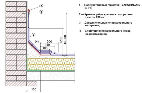 В месте стыка кровли с вертикальной стеной укладывается дополнительный слой подстилающего материала. Он должен заходить на вертикальную поверхность не менее чем на 250 мм, на скате должно лежать не менее 200 мм. Вся поверхность дополнительного слоя промазывается мастикой, хорошо прижимается. После чего верхняя часть еще крепится металлической краевой рейки. Она крепится к вертикальной поверхности  саморезами с шайбами не менее 50 мм в диаметре. Стык рейки со стеной заливают полиуретановым герметиком.