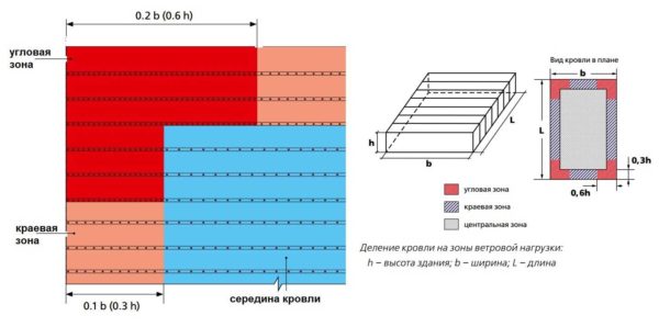 • Схема установки крепежа зависит от угла ската кровли, высоты здания, ветровых нагрузок в регионе. Наиболее частая установка — в углах крыши (шаг 25 см). Тут самые большие ветровые нагрузки. Чуть реже ставят крепеж в краевой зоне (до 35 см) — тут нагрузки средние. Реже всего устанавливается крепеж в центральной области кровли (до 50 см).