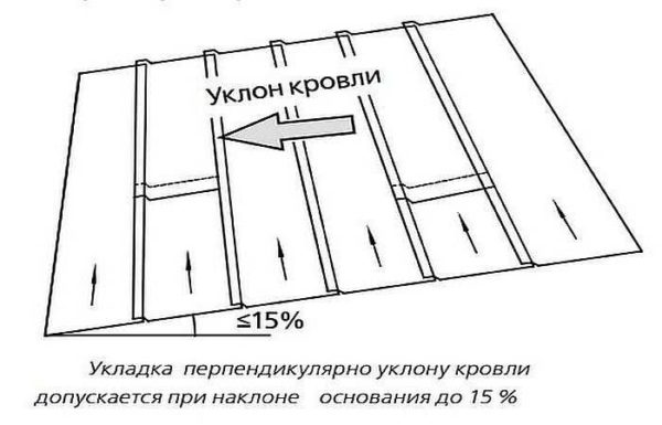 При уклоне кровля до 15% рулонную кровлю раскатывают параллельно скату