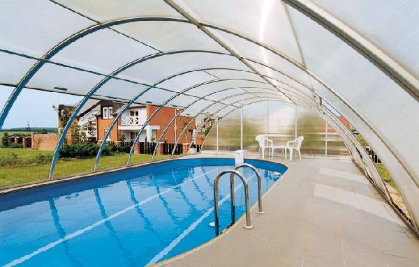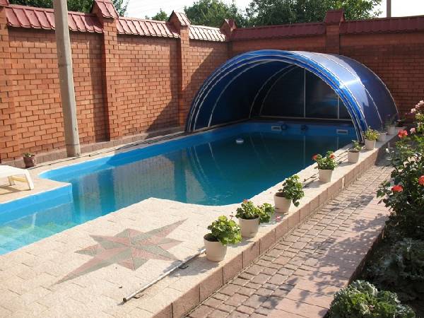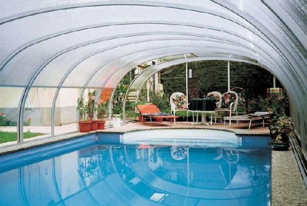 Бассейны уже давно перестали быть диковинкой на территориях частных домов. Но они требуют особого ухода, в частности, необходимо позаботиться о том, чтобы сухие листья и различный мусор не засоряли воду, так как чистка бассейна — дело довольно кропотливое. Навесы из поликарбоната во дворе частного дома над бассейном помогут решить это вопрос. Во время купания в солнечную погоду, конструкцию можно сложить, оставив часть заслона над территорией с шезлонгами. Если же на улице сильный ветер или дождь, навес легко раздвигается, превращаясь в сплошной заслон. В таком виде он пребывает и во время простоя. Специалисты советуют выбирать для бассейна материал голубого цвета, который придаст воде естественный оттенок.