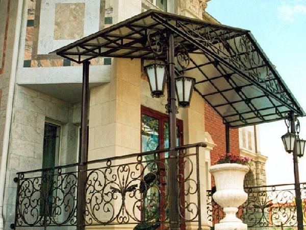 Без этой замечательной конструкции не может обойтись ни один парадный вход. Такие навесы из поликарбоната над дверью частного дома просто необходимы. Имея надежный заслон от атмосферных осадков, можно чувствовать себя комфортно в поисках ключей или раскрывая зонтик при выходе из дома. Кроме того, навес надежно защищает порог и ступеньки от налипания мокрого снега. По-особенному элегантно выглядит навес, собранный на основе кованого каркаса, что наилучшим образом подходит к классическим постройкам и зданиям, оформленным под старину.