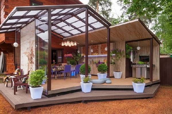 Навесы из поликарбоната во дворе частного дома для оборудования летней открытой кухни