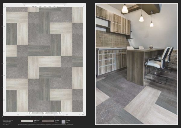 Главное и основное отличие Арт Винила — в большом количестве вариантов. Дело не только в расцветках и фактурах, а в том, что это покрытие можно комбинировать, создавая рисунки и композиции. Есть готовые схемы укладки, но можно их создавать индивидуально.