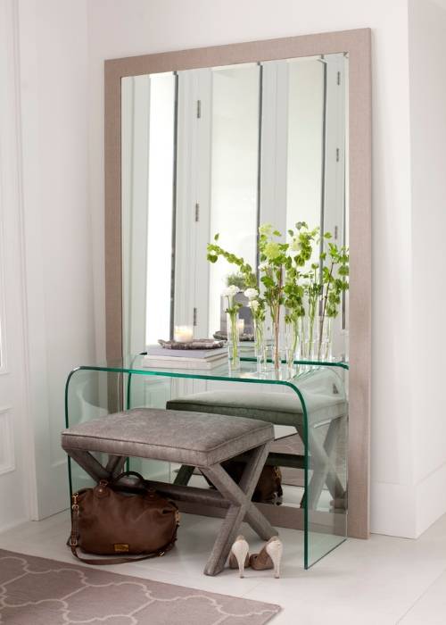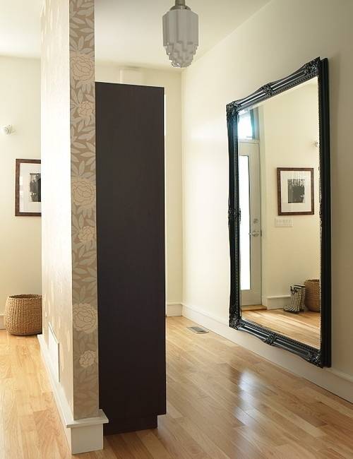 Будучи повешенным на стену, зеркало в прихожую в полный рост не будет занимать много места. Напротив, оно будет визуально расширять границы интерьера. В целях экономии пространства его даже можно дополнить тонким столиком консолью, полкой или банкеткой.