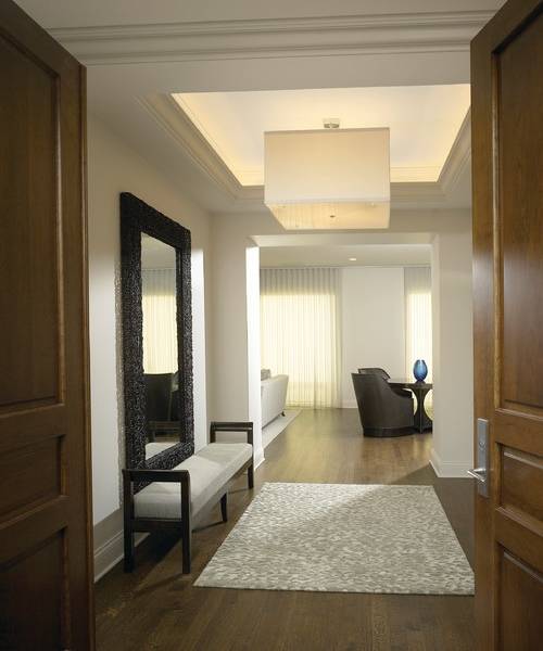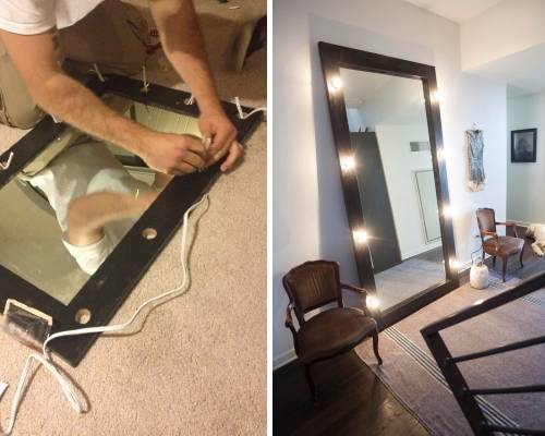 А еще нам хотелось бы обратить ваше внимание на встроенную подсветку для зеркала в прихожей, которую можно сделать своими руками, и идею размещения на потолке современной спот-системы.