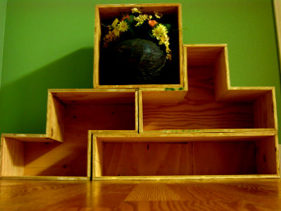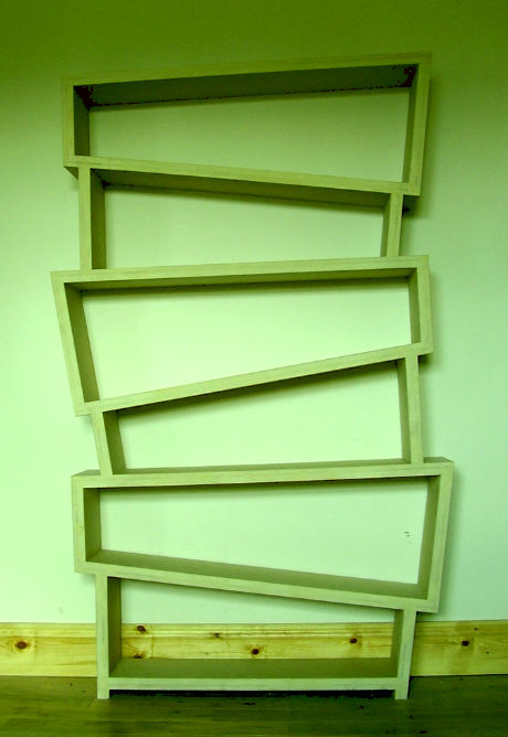 Следующая полка — стеллаж, она тоже очень вместительна, необычность задумки заключается в наклонном расположении каждого деления. Если данную полочку покрасить в какой-нибудь кислотный цвет, она просто идеально впишется в ультрамодное направление «поп-арт».