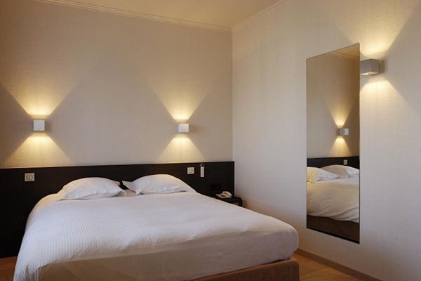 - Американский подход — один светильник освещает только часть комнаты, однако, включая все бра, отпадает необходимость в общем освещении спальни.