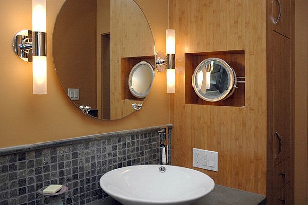 Помните, что бра в ванной комнате должны быть не столько эстетичными, сколько функциональными. К тому же, если ваша ванная небольшая, то пара бра с легкостью возьмут на себя роль основного освещения. Правильно подобранные настенные светильники в ванну способны не только осветить ее, но и добавить тепла в, казалось бы, стерильное и холодное помещение.
