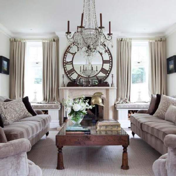 В гостиной необходимо размещать красивые настенные часы, подходящие к интерьеру комнаты, ведь они всегда на виду.