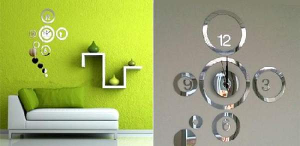 В последнее время гостиную комнату все чаще оформляют в стиле хай-тек. В нем все предметы интерьера современные и функциональные. Поэтому и настенные часы также должны быть в стиле хай-тек. Так, к примеру, в такой интерьер прекрасно впишутся стеклянные настенные часы, как на следующих фото.