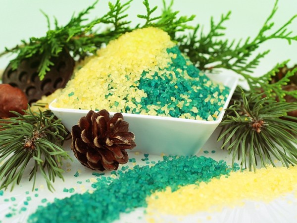 Соль в ванной комнате может быть не только основой полезной процедуры, но и достаточно привлекательным декоративным элементом. Все, что вам потребуется – красивая стеклянная емкость, морская соль и пищевой краситель. Что же получится?
