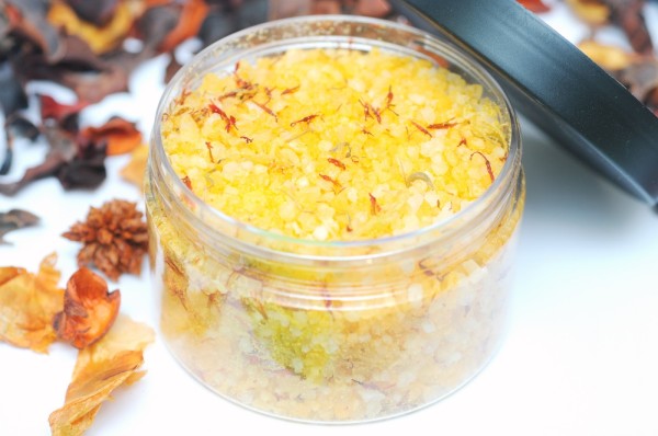 В 0,5 кг соли добавьте 3 капли красителя оранжевого цвета, тщательно перемешайте и всыпьте в стеклянную емкость с крышкой. Перед закупориванием добавьте 3-4 капли грейпфрутового эфирного масла. Чтобы соль окрасилась равномерно, не забывайте систематически переворачивать емкость.
