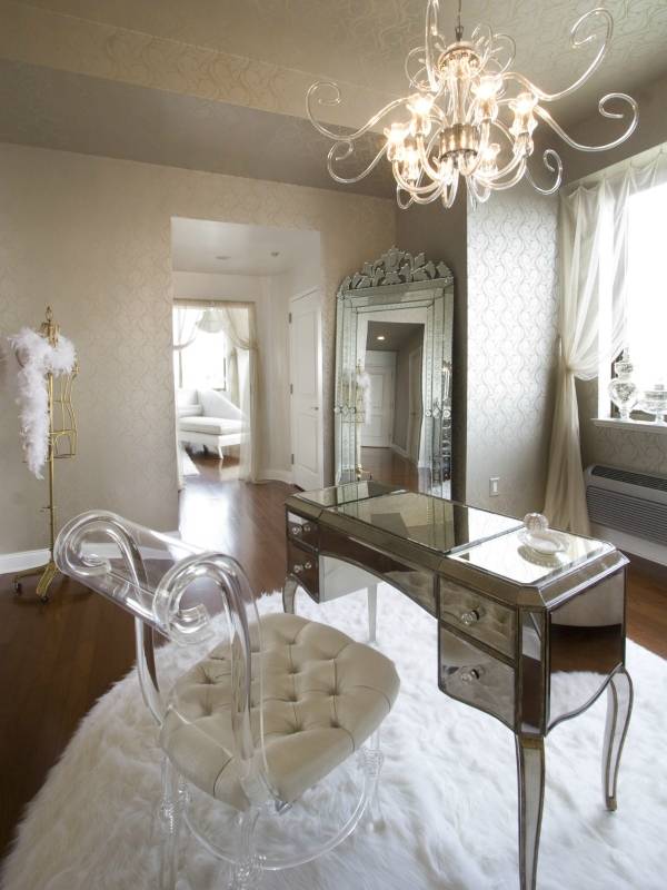 Классная идея для стильного дизайна интерьера: сочетание прозрачной акриловой мебели и роскошных отделочных материалов, например, меха или пушистых ковров.