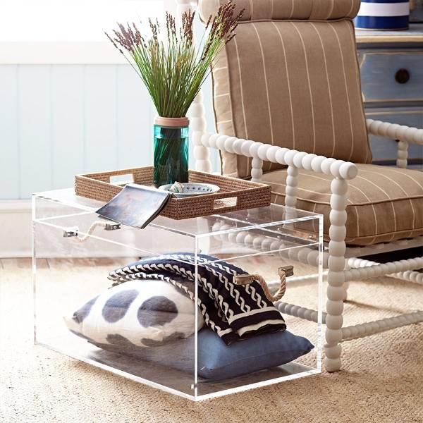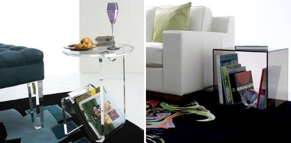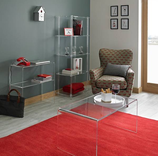 Еще одно достоинство акриловой мебели — это удобство организации хранения вещей. Так, прозрачная полка или этажерка позволяет быстро найти нужный журнал или любой другой предмет, который в ней хранится, ведь её содержание просматривается со всех сторон!
