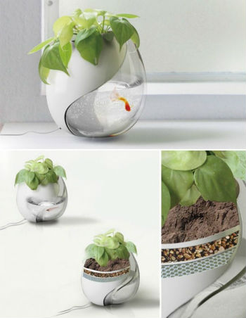 Оригинальные цветочные горшки пользуются невероятной популярностью, взять к примеру, такой очень необычный горшок-аквариум. С одной стороны, конструкция засыпается землей и высаживается цветочек, с другой стороны наливается вода и подселяется рыбка! Невероятно эффектно!