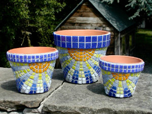 Такие горшочки вполне можно создать самостоятельно, для этого необходимо запастись цветной мозаикой, и выложить необходимый узор на поверхности изделия.