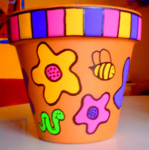 Изготовить данное изделие не составит труда, необходимо лишь перевернуть горшок вверх дном, и пролить на него краску светлее основного тона глиняной поверхности.