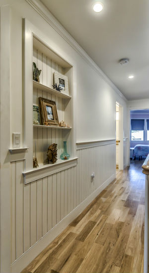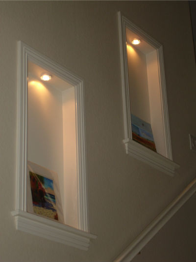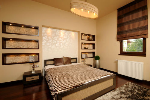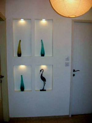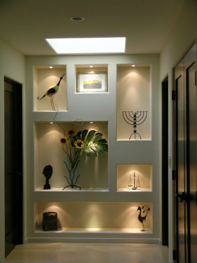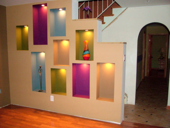 Такое дополнение помещения подойдет современным интерьерам, их часто располагают в спальне и коридоре. В случае со спальней они используются, как полочки для хранения различных мелочей, в коридоре больше играют декоративную роль, поэтому в них часто монтируют цветную подсветку. Также в коридоре такая ниша может послужить отличной полочкой для ключей и сотовых телефонов.
