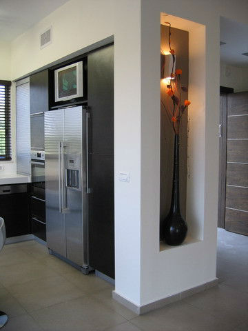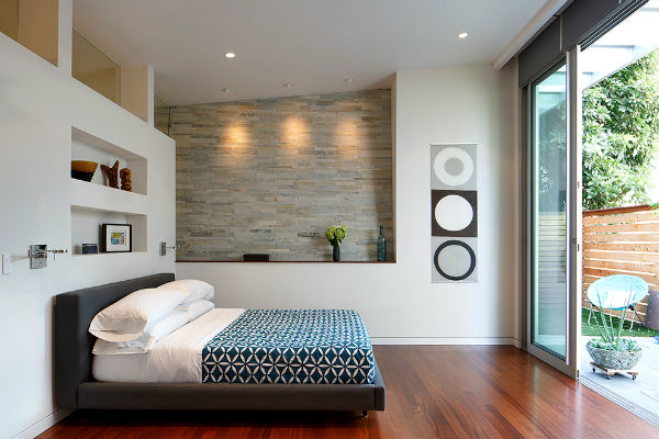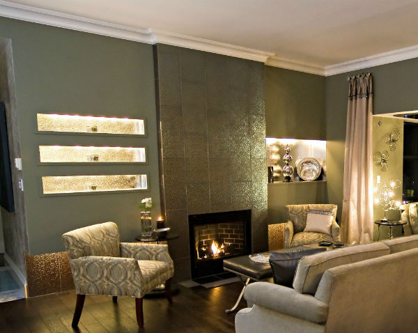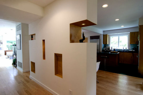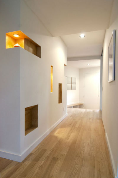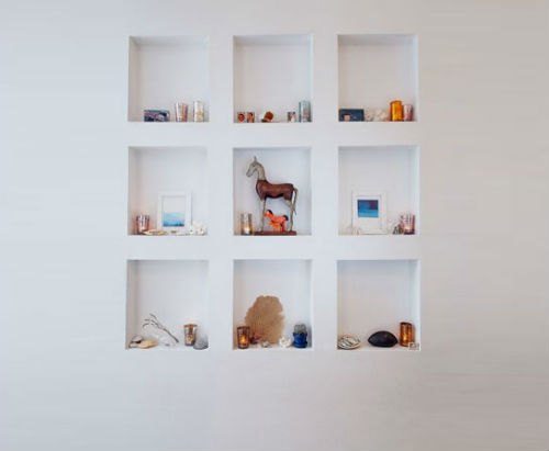 ► Несколько ассиметрично расположенных ниш на одной стене привнесут в интерьер долю динамики и современного превосходства. К примеру, одна ниша прямоугольной формы будет расположена в центре стене, четыре других разных размеров по краям от нее.