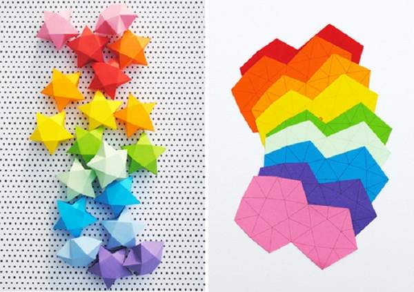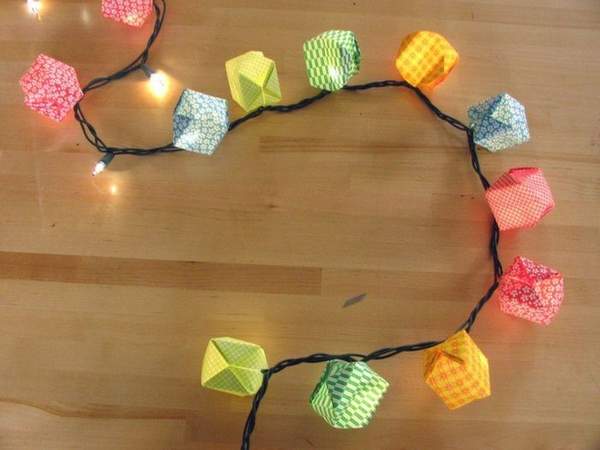 С помощью многоцветной светодиодной гирлянды, можно изготовить красивые подвесные украшения, если смастерить из бумаги мини-плафоны на лампочки. Это может быть гирлянда новогодняя с подсветкой из бумаги, сложенная по технике оригами, в результате чего получаются славные объемные плафончики (все этапы изготовления представлены на фото в статье).