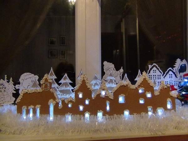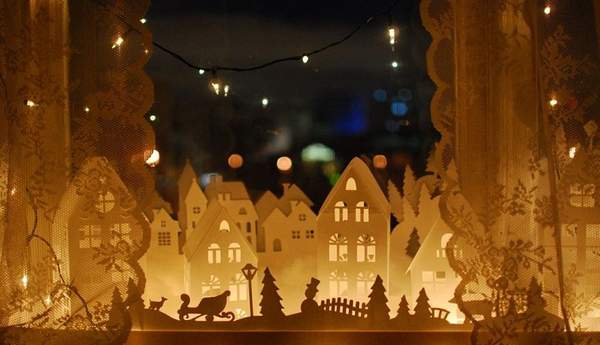 Используя электроосвещение, можно изготовить совершенно волшебные новогодние поделки из бумаги своими руками и гирлянды. Например, с помощью трафаретов нарисовать и вырезать целый город, разместить его на подоконнике, а во внутрь композиции положить светодиодную гирлянду. Светящиеся улочки и вырезанные окошки домов будут создавать довольно таинственный эффект.
